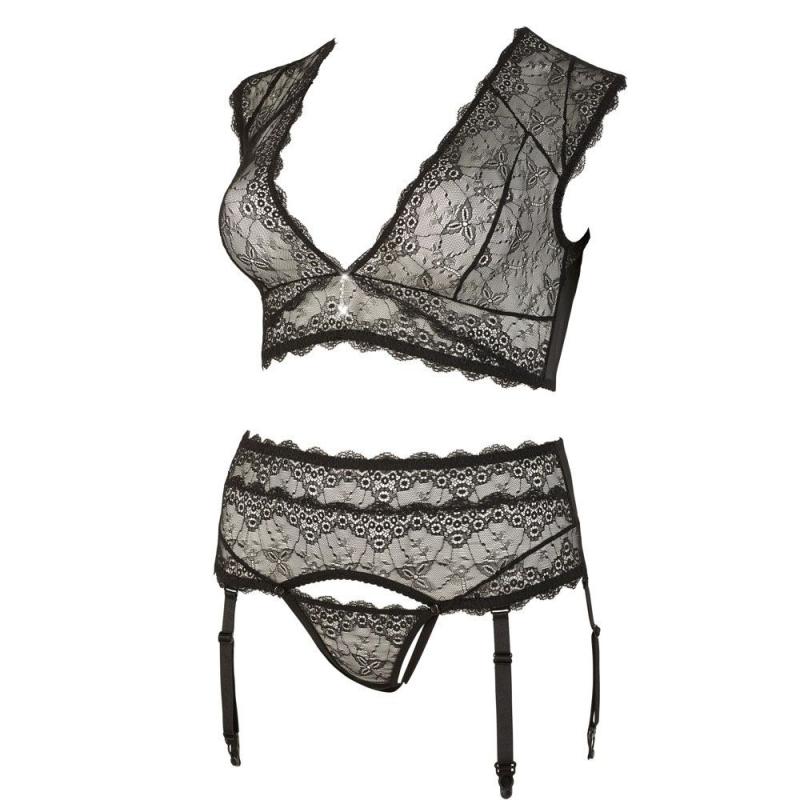 Sinnliche Verführung mit außergewöhnlichem Komfort Bralette und Strapsschnur aus weicher, dehnbarer Spitze, kombiniert mit Powernet. Bralette mit dekorativen Strasssteinen im tief ausgeschnittenen Spaltbereich mit Hakenverschluss hinten. Die Hosenträgerschnur mit 6 verstellbaren und abnehmbaren Hosenträgerbändern und abnehmbarem Schnurteil, das auch aufgeknöpft werden kann. Wenn der Saitenteil entfernt wird, laufen nur 2 dehnbare Gurte über den offenen Schritt. 90% Polyamid, 10% Elasthan. Ohne Strümpfe.