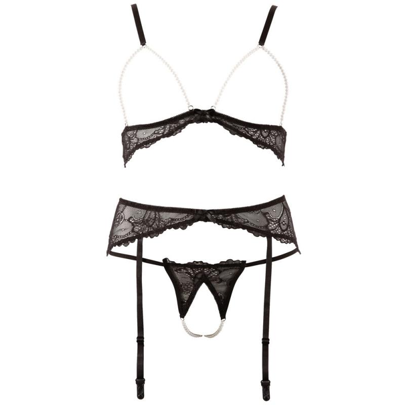Für Frauen, die gerne die Initiative ergreifen. Spitzenset, das einen kabellosen BH, einen String ohne Schritt und einen Strapsgürtel enthält. Die Perlen betonen die nackten Brüste und den offenen Schritt, sehr feminin aber es geht auch auf den Punkt. Die Träger des BHs und der Strapse können verstellt werden. 90% Polyamid, 10% Elasthan.