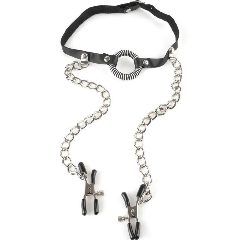Das Produkt besteht aus einem kleinen Metallring als Knebel, umwickelt mit Leder, verbunden mit zwei starken Lederbändern zur Anpassung an den Hals und zwei Ketten mit Nippelklemmen. Dank seiner verstellbaren Riemen aus Leder kann er an die gewünschten Größen und Spannungen angepasst werden. Indem Sie bei geöffnetem Mund am Ring ziehen, kontrollieren Sie die Spannung der Pinzette. Die Lederriemen sind verstellbar und passen auf die meisten Größen.
