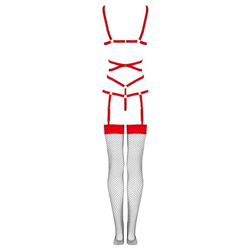 Das Oberteil des Sets besteht aus sexy schwarzen Streifen, die auf dem Bauch ineinander verschlungen und mit Ringen verbunden sind. Die Träger oben umschließen die Brust elegant, ohne sie zu bedecken, während sie sich unten sanft in einen Tanga verwandeln. Einzelne Träger verlaufen an beiden Seiten des Tangas und schmiegen sich charmant an die Hüften. Der untere Teil des Sets besteht aus schwarzen Strümpfen mit verstellbarer Länge aus Netzstoff. Die Strümpfe sind vorne und hinten mit Verschlüssen am Oberteil des Outfits befestigt.