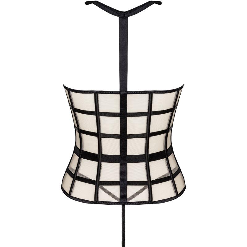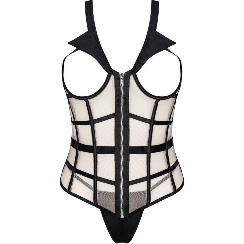 Ein zweiteiliges Set bestehend aus einem sinnlichen, üppigen Korsett und einem sexy schwarzen Tanga. Das Korsett hat vorne einen Reißverschluss, der das Anziehen erleichtert. Die Farben des Sets sind Schwarz und Beige, die zusammen eine attraktive Kombination ergeben. Es lohnt sich auch, auf verführerische Details wie einen schwarzen Kragen oder schwarze Gürtel zu achten, die so angeordnet sind, dass sie die Taille optimal betonen. Was an diesem Korsett am meisten auffällt, sind die Ausschnitte, die die Büste freilegen. Dies macht das ganze Set sehr gewagt und provokativ. Der Fantasie bleibt nicht viel überlassen. Brustwarzenaufkleber werden eine großartige Ergänzung des Spiels sein und etwas Würze verleihen.