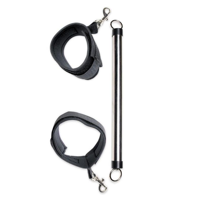Open wide! This beginner's metal Spreader Bar will put you or your partner in the right position for pleasure every time. Attach the adjustable ankle cuffs and your subject won't be able to close their thighs. Try new positions and scenarios you never dared, and do it all with easy access. They'll squirm around and squeal, but they won't get out! The detachable cuffs have a comfortable soft-neoprene inner lining thats easy on the ankles.