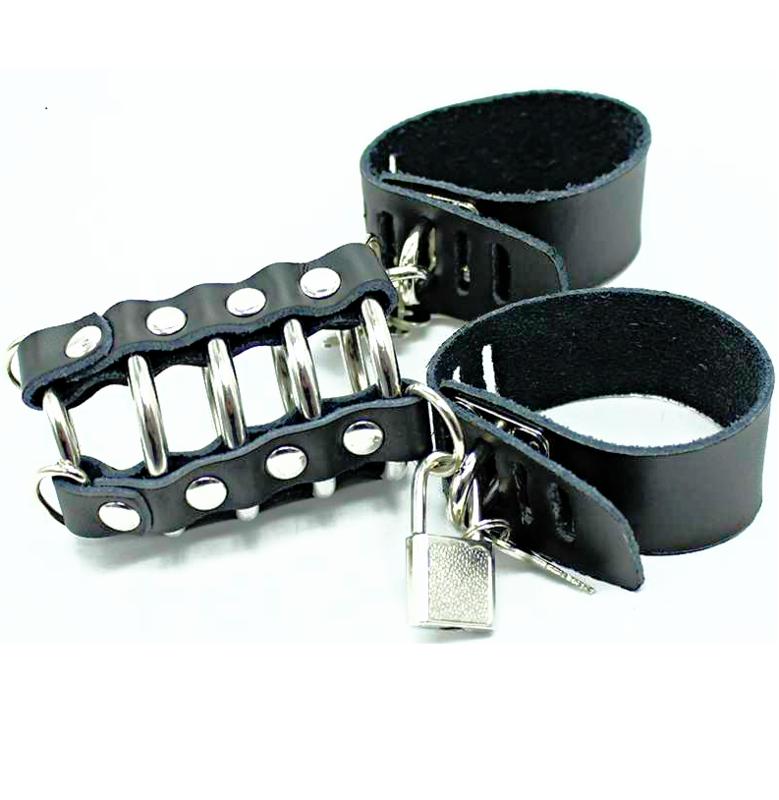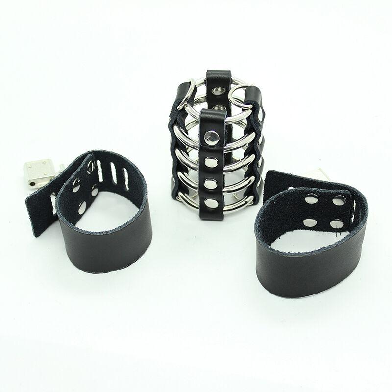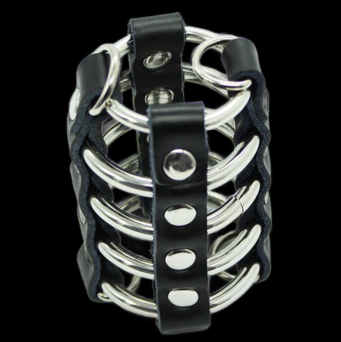 Ohmama Fetish Leather Strap Metal Ring Cock Cage With Ball Divider