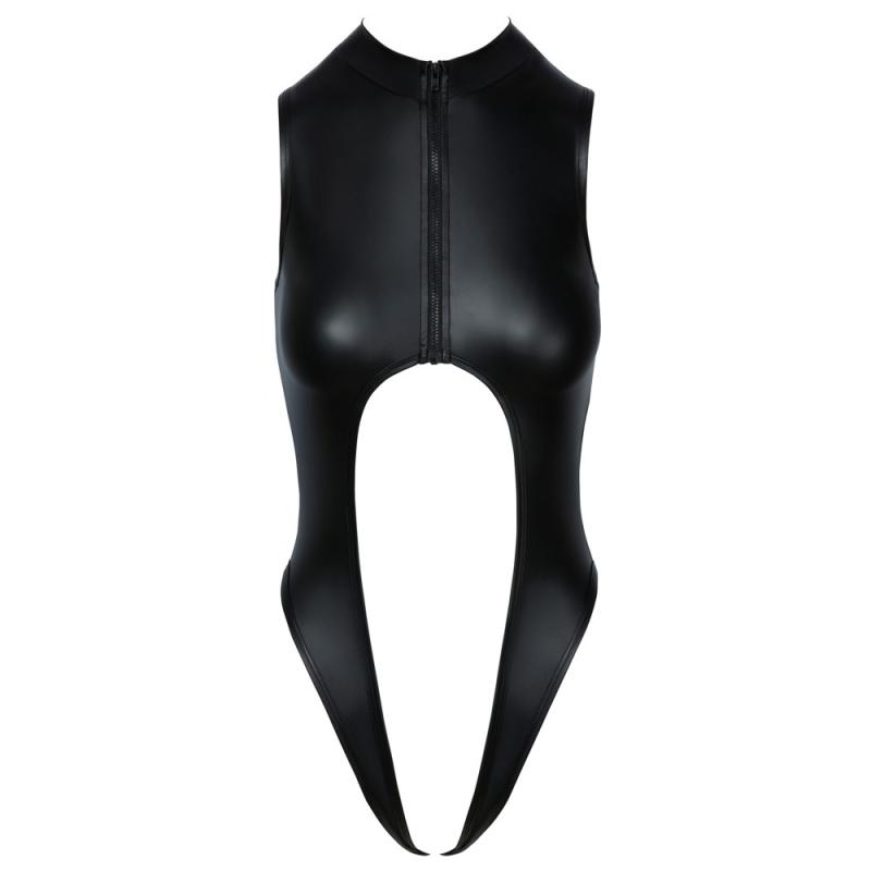 Sleeveless open bodysuit by Cottelli LINGERIE in a trendy black matte look. Soft and elastic for a high level of comfort. High neck at the top and with a full-length zip from the small stand-up collar to under the chest. Unashamedly open at the bottom at the front, back and crotch!