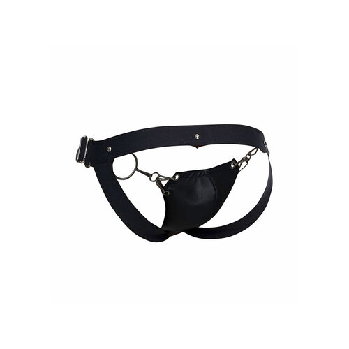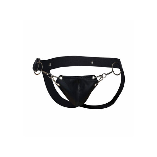 The Snap Jockstrap is made of strong faux leather in sleek black. With minimal coverage at the back, sweat can evaporate more freely offering the wearer a more comfortable fit. A chain-link pouch at the front supports the penis without scrimping on sex appeal, whilst wide straps sit on the hips for a supportive finish.