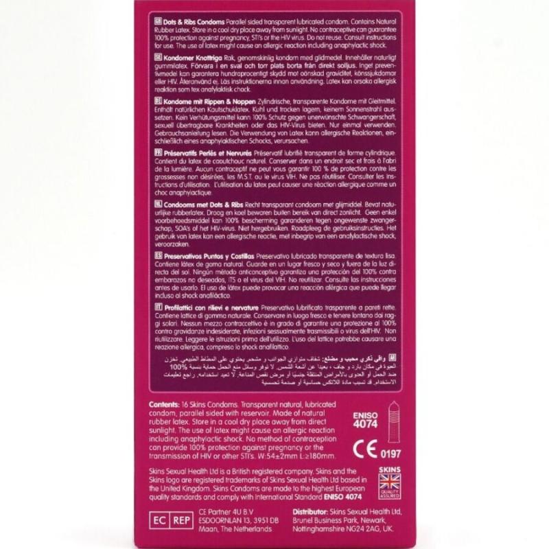 Skins has combined strategically placed raised ribs to deliver enhanced pleasure to the wearer along with deliciously delicate dots to deliver enhanced sensation to the partner, working in harmony to maximize pleasure and enjoyment for both partners during those intimate moments. Skins Dots & Ribs condoms are made from premium natural latex for an enhanced, durable, transparent feel. So thin they feel like a second skin! Never go in without a Skin! When used correctly, Skins Dot & Ribs greatly reduce the risk of pregnancy and sexually transmitted infections, although no contraceptive method can provide 100% protection.