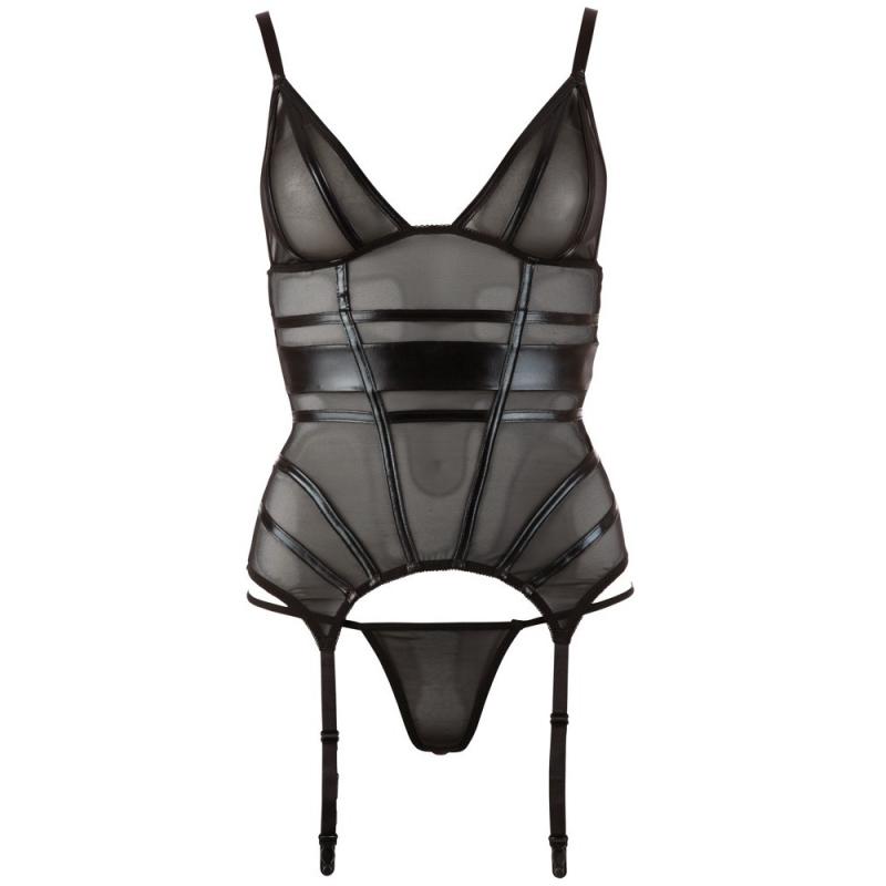 Black suspender basque and g-string set made out of powernet with wetlook stripes.