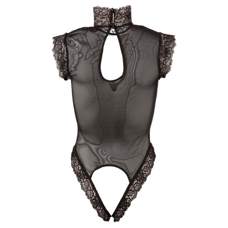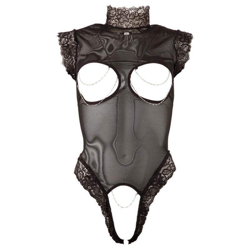 Cottelli Cupless and Crotchless sheer Body with lace trim on the arms and collar. 2 buttons back and leg openings. Breast and crotch are decorated and open with removable chain.