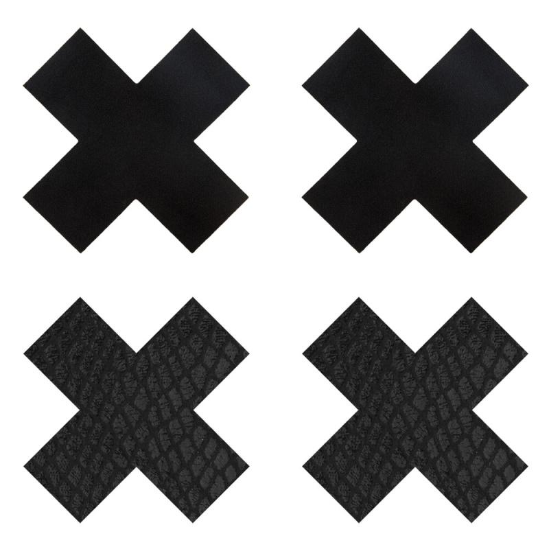 Self-adhesive X-shaped pasties include a black satin set