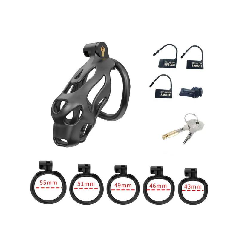 The opening at the front of each P-Cage allows the wearer to urinate without removing the cage. This penis cage set includes 5 rings in different sizes, ranging between 43 - 55 mm. In addition, it includes 1 copper built-in lock and 3 plastic numbered padlocks.