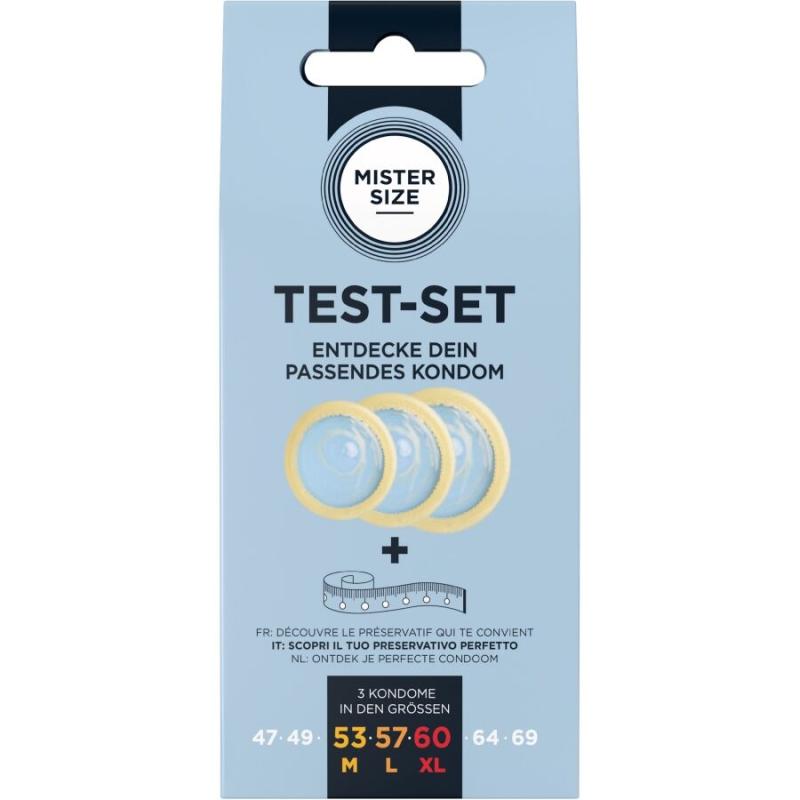 Find your size with the size test kit. The MISTER SIZE test kit, with measuring tape and medium trial pack, helps you discover your ideal condom size. The sizes 53 mm, 57 mm, and 60 mm included in the kit cover the most common ones. If you use a different size, you can check it with the measuring tape and feel the difference with the medium trial pack.