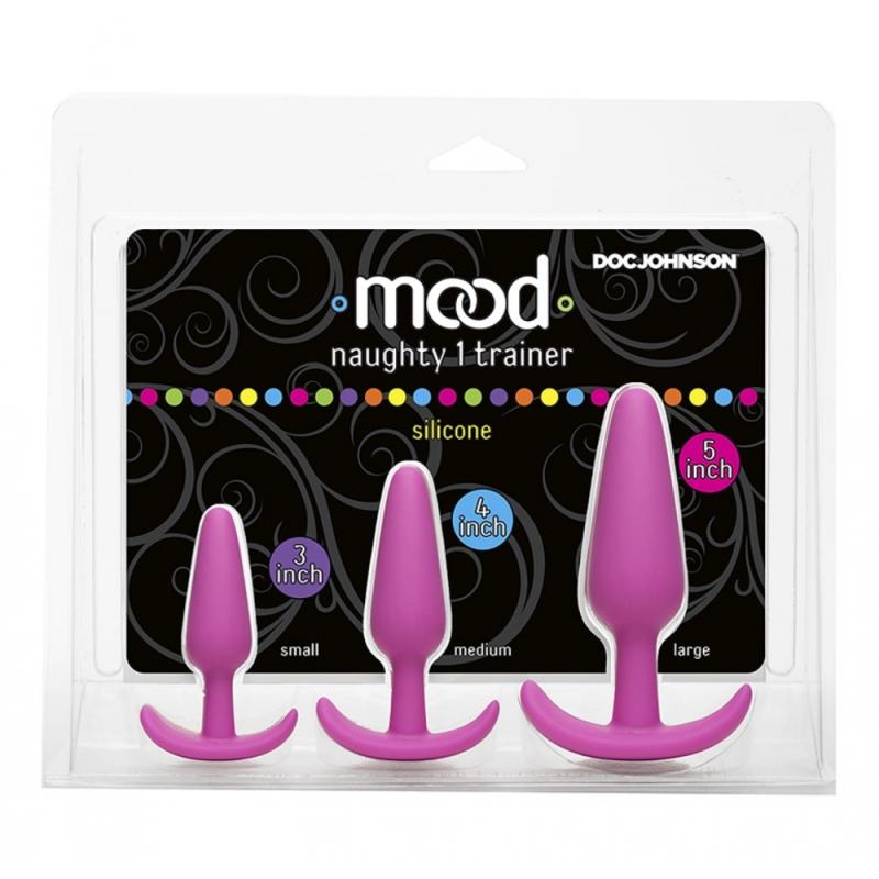 How naughty do you want it? The Mood Naughty 1 Trainer Set in premium silicone includes our bestselling original Mood Naughty butt plug in three graduated sizes. Measuring at 3, 4, and 5 inches, this set is perfectly shaped and sized to help backdoor beginners gently expand the boundaries of their anal experience. The classic tapered tip of Mood Naughty slides right in, and the firm yet flexible material and curved rocker base make these plugs comfortable and safe for extended wear.