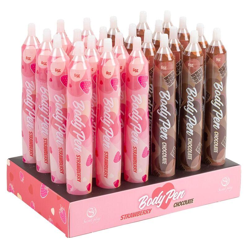 L'espositore di penne commestibili per body painting del marchio Secret Play è una soluzione elegante e pratica per chi vuole aggiungere un tocco di divertimento e sensualità ai propri momenti intimi. Questo espositore contiene 24 unità di penne commestibili, presentate in un'attraente varietà di gusti, tra cui fragola e cioccolato, offrendo un'ampia gamma di opzioni per soddisfare tutti i gusti.