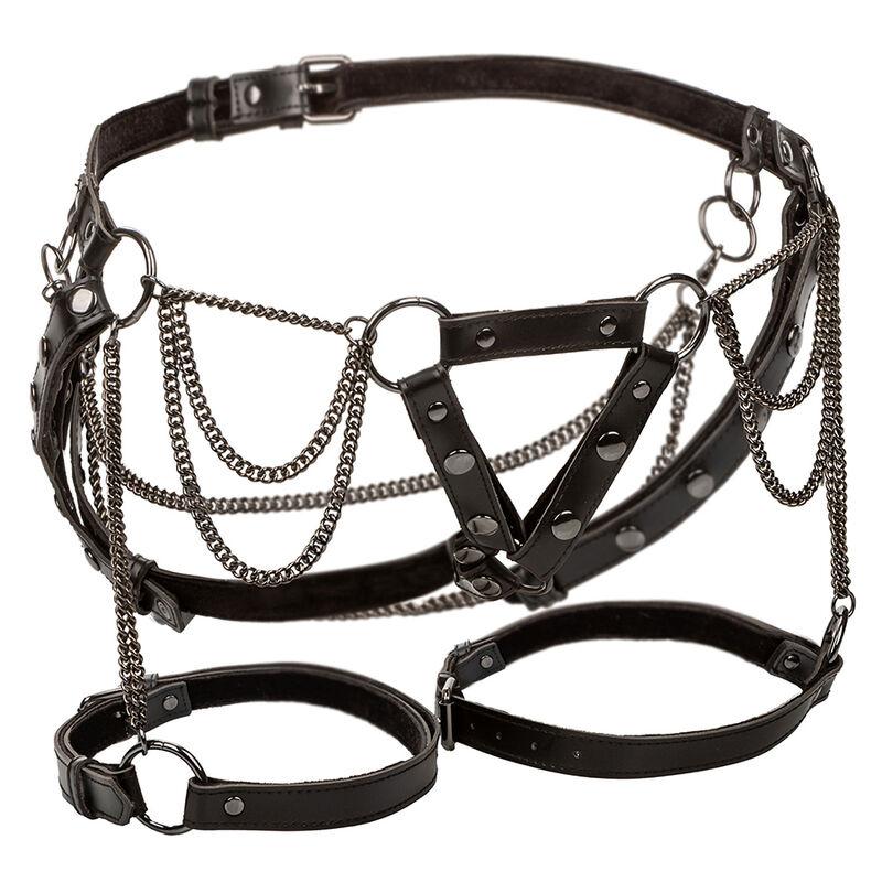 Decorata con robuste catene di metallo, questa imbracatura per le cosce di alta qualità è un capo essenziale per chi ama la seduzione e il potere.