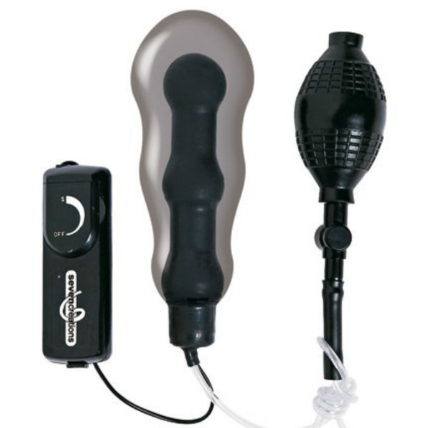 Triple-beaded latex shaft. Multi-speed inflatable anal vibe. Double its size inside your body!