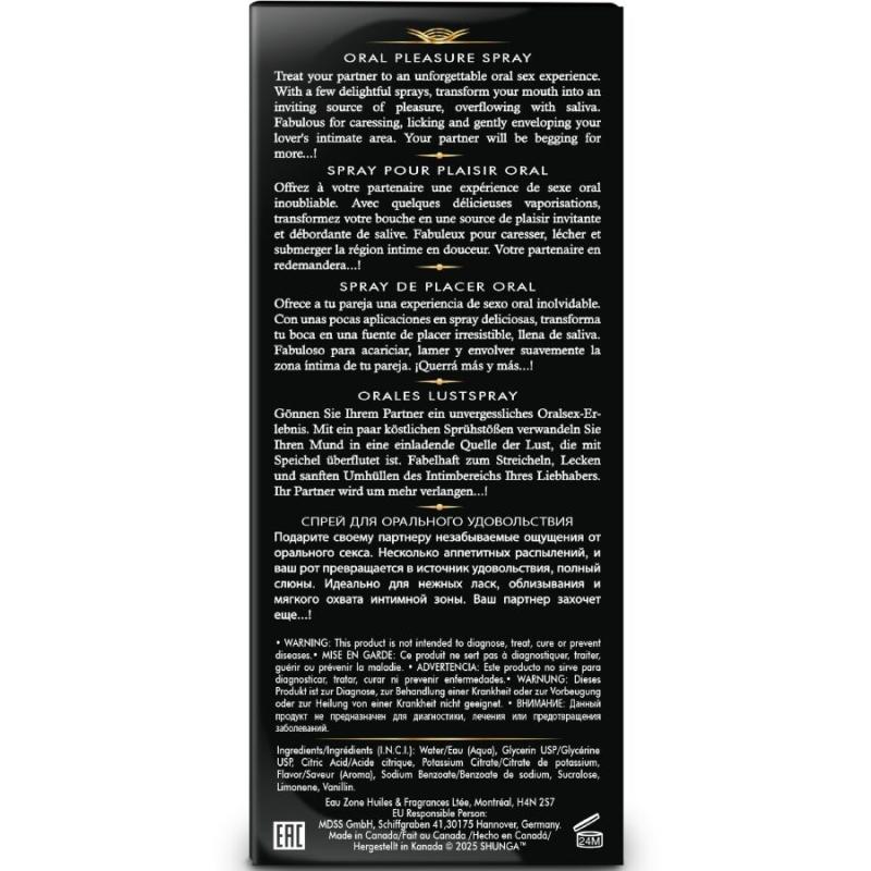 Ontdek een nieuwe manier om van orale seks te genieten met deze spray die de ervaring naar een hoger niveau tilt. Met slechts een paar sprays krijgt je mond een zachtere, vochtigere textuur, perfect om sensueel elke intieme hoek van je partner te verkennen. De heerlijke smaken prikkelen de zintuigen en transformeren elke kus, elke lik en elke aanraking in een onweerstaanbare stimulans die het verlangen op natuurlijke wijze doet toenemen.