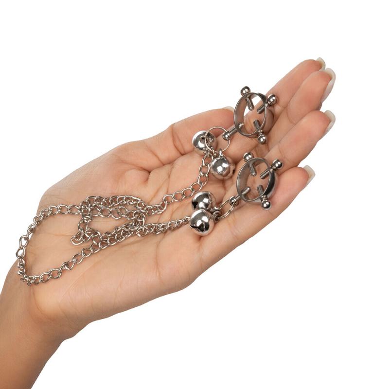 Dodaj trochę zabawy swojemu życiu seksualnemu dzięki 4-punktowej wyciskaniu sutków z uchwytami do sutków z dzwoneczkami. Zwiększ luz sutków za pomocą prostego przekręcenia śrub. Dokręć śruby dokładnie do żądanego nacisku i pociągnij za łańcuszek, aby uzyskać satysfakcjonujące uczucie szarpania z dzwonkami dzwoniącymi z przyjemnością.