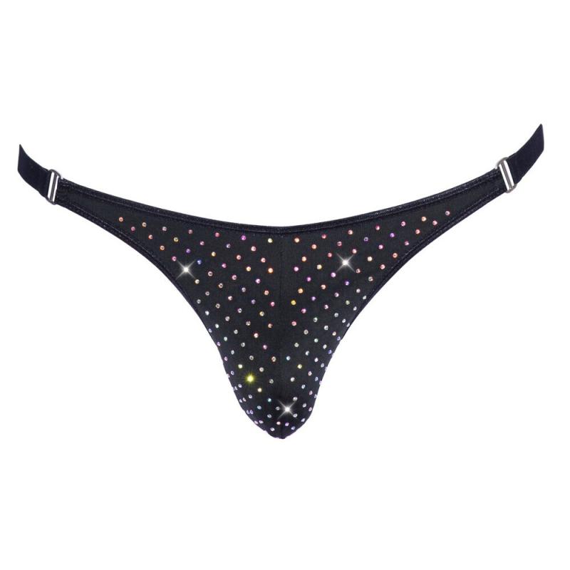 Na woreczku sznurek z błyszczącymi cyrkoniami. Niezwykle wygodny. Ekskluzywny design z błyszczącymi kryształkami! Ekstrawaganckie czarne stringi Svenjoyment z licznymi kolorowymi cyrkoniami z przodu. Jest cudownie rozciągliwa, co oznacza, że jest niezwykle wygodna w noszeniu. 90% poliester, 10% spandex.