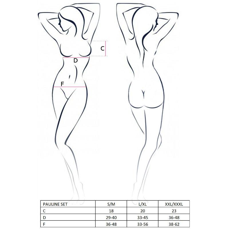 O conjunto da coleção Pauline é um fabuloso conjunto de lingerie com um design espetacularmente sexy com o qual você se tornará uma bomba de sedução, fabricado pela prestigiada marca de lingerie Passion
