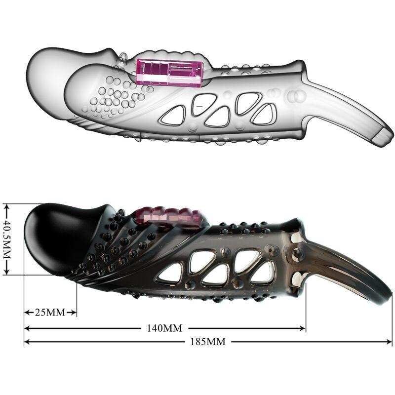 Divirta-se com esta manga peniana vibratória. Esta manga peniana que melhora a ereção e promete prazer é feita de TPR macio e é presa no lugar por um laço de bola. Um vibrador na ponta estende o comprimento do seu pênis e é ativado no contato. Ao estimular a cabeça do seu eixo, você também fornece estimulação interna para ela. A manga elástica envolve seu pênis para uma ereção mais forte e duradoura, dando a você mais tempo para aproveitar as vibrações!