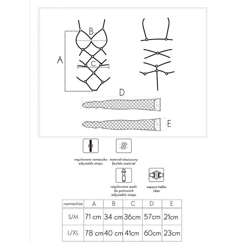 A parte superior do conjunto é composta por sensuais listras pretas, entrelaçadas na barriga e conectadas por anéis. As alças na parte superior envolvem elegantemente o busto sem cobri-lo, enquanto na parte inferior transformam-se suavemente em tanga. Alças individuais percorrem ambos os lados da tanga, abraçando charmosamente os quadris. A parte inferior do conjunto é composta por meias pretas de comprimento ajustável, confeccionadas em malha. As meias são presas com fechos na parte superior do traje, na frente e nas costas.